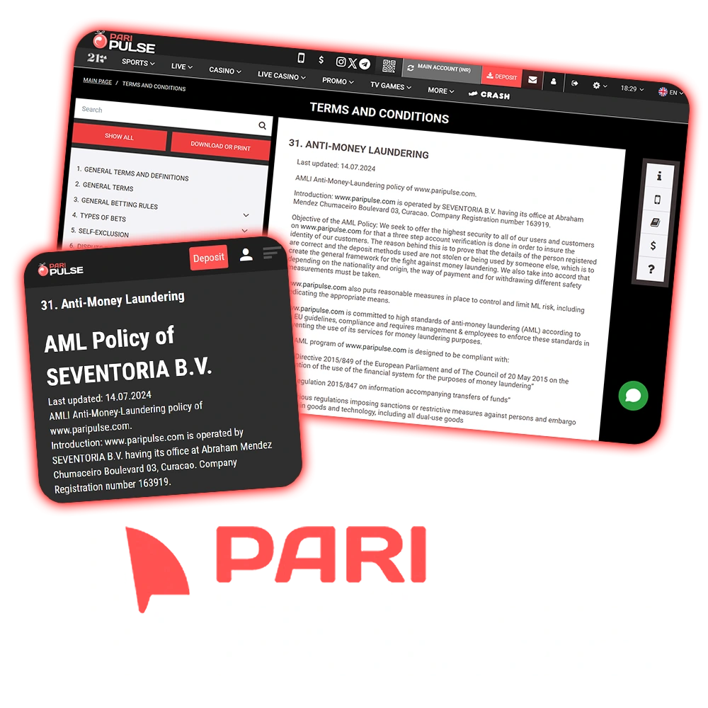 Introduction: SEVENTORIA B.V., a company lawfully registered under Curaçaoan legislation, is the operator of the PariPulse platform. The company is registered under the number 163919 and has its official location at Abraham Mendez Chumaceiro Boulevard 03, Curacao. PariPulse, as a responsible operator, guarantees adherence to international standards and legal frameworks to stop money laundering and related illegal actions.