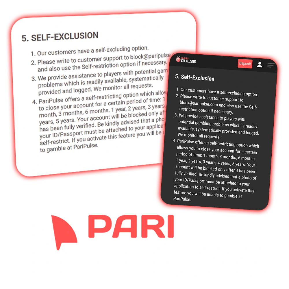 - You can use PariPulse’s self-restricting feature to shut down your account for a specific amount of time, such as one month, three months, six months, a year, two years, three years, four years, or five years. Only once your account has been thoroughly validated may it be banned. Please note that in order to self-restrict, a photo of your ID or passport must be included with your application. You will not be able to gamble at PariPulse if you enable this option.